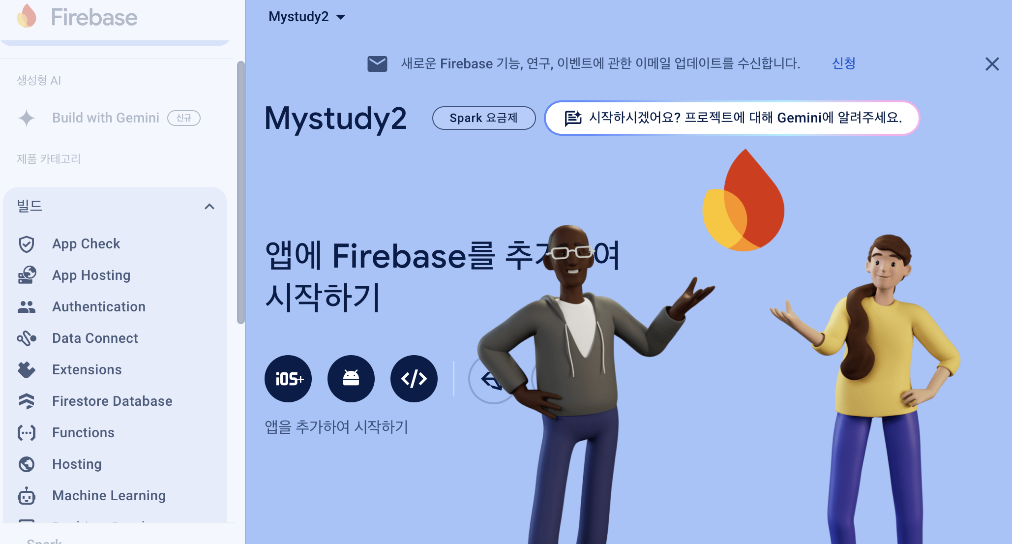 3. 기다리다보면 해당 창에 오게 되는데 우측에 빌드 부분에 Authentication은 로그인 인증, Firesotre Database는 firestore인데 회원가입같은거를 했을 때 그 유저의 정보를 담는 기능을 하는 것 같음. 그리고 storage는 이미지등을 저장하는 곳임(아래 내리다보면 있음)