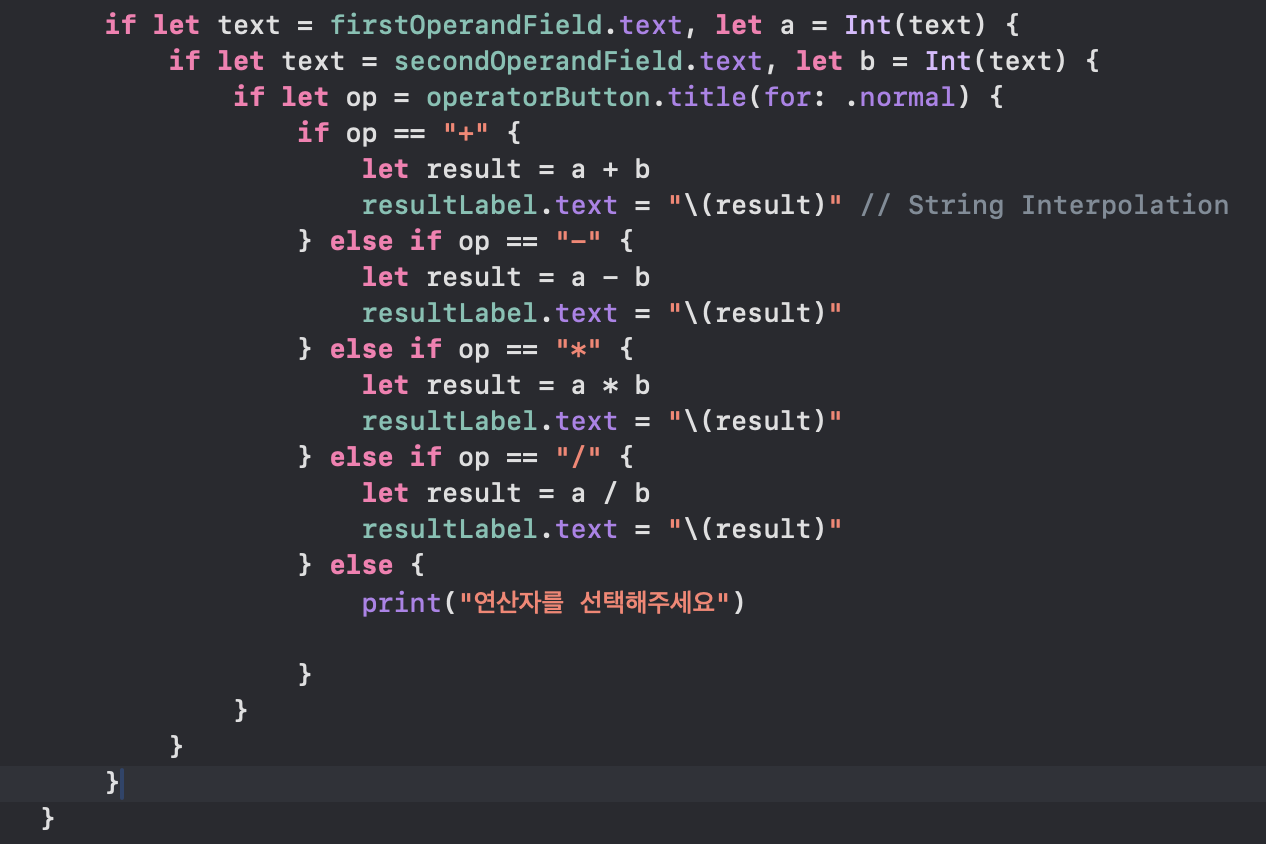 => 맨위 `if let text = firstOperandField.text, let a = Int(text)`코드블럭 안에 아래의 코드들을 담으면 됨