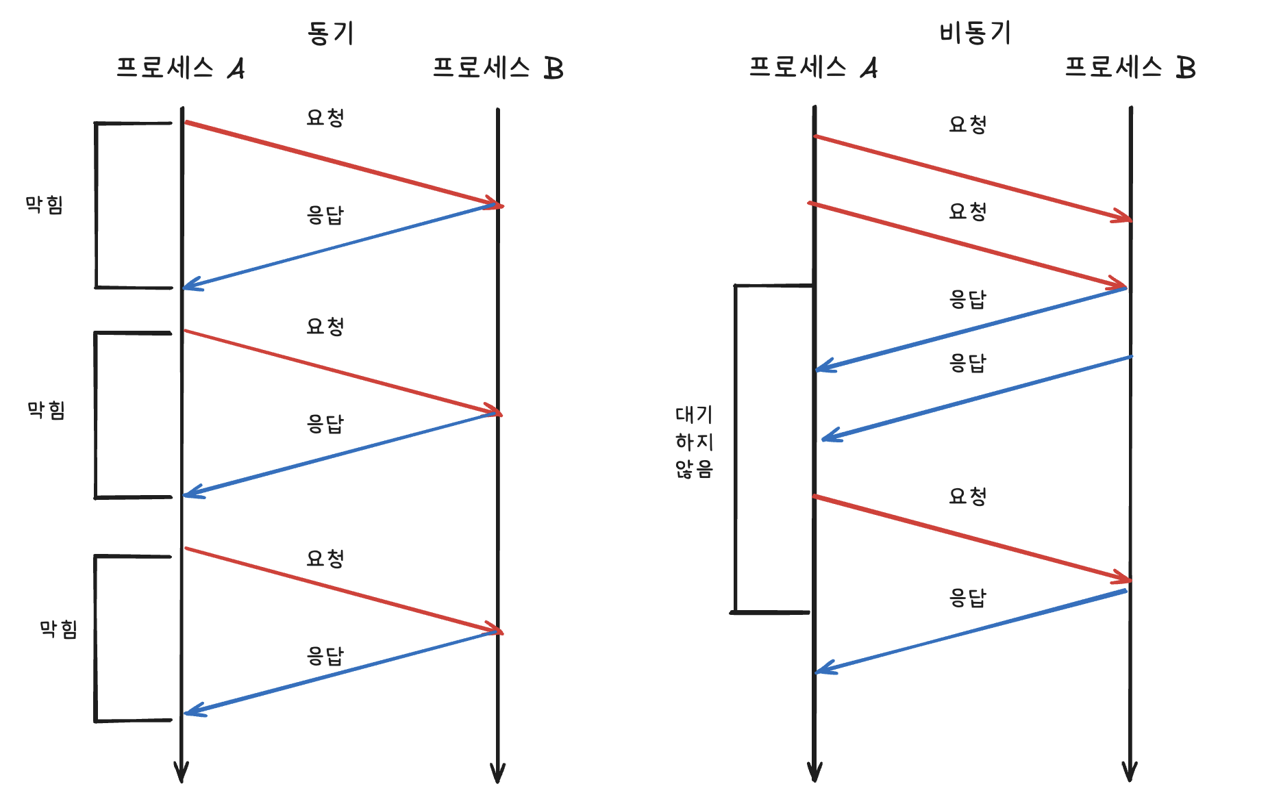 - `blocking`방식 -> 이전 작업이 끝날 때까지 기다림.