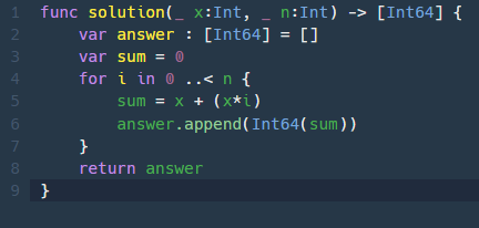 for문을 사용해 0부터 n보다 낮은 수까지 반복해 n개의숫자를 sum이라는 변수에 x값에 x와i를 곱해서 더해주는 것으로 생각.