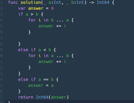 두 정수 a, b가 주어졌을 때 a와 b사이에 속한 모든 정수의 합을 리턴하는 함수, solution을 완성하세요.