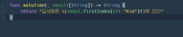 String형 배열 seoul의 element중 "Kim"의 위치 x를 찾아, "김서방은 x에 있다"는 String을 반환하는 함수, solution을 완성하세요. seoul에 "Kim"은 오직 한 번만 나타나며 잘못된 값이 입력되는 경우는 없습니다.
