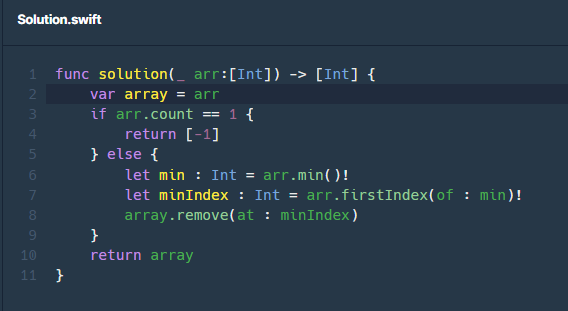 정수를 저장한 배열, arr 에서 가장 작은 수를 제거한 배열을 리턴하는 함수, solution을 완성해주세요.