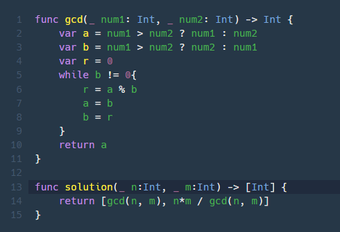 두 수를 입력받아 두 수의 최대공약수와 최소공배수를 반환하는 함수, solution을 완성해 보세요. 배열의 맨 앞에 최대공약수, 그다음 최소 공배수를 넣어 반환하면 됩니다. 예를 들어 두 수 3, 12의 최대 공약수는 3, 최소 공배수는 12이므로 solution(3, 12)는 [3, 12]를 반환해야 합니다.