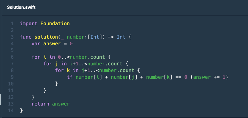 한국중학교 학생들의 번호를 나타내는 정수 배열 number 가 매개변수로 주어질 때, 학생들 중 삼총사로 만들 수 있는 방법의 수를 return하도록 solution 함수를 완성하세요.