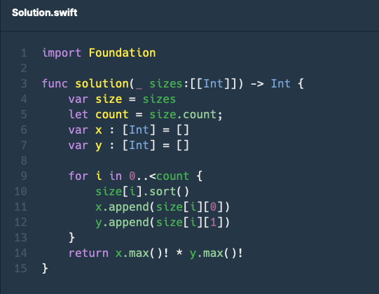 모든 명함의 가로 길이와 세로 길이를 나타내는 2차원 배열 sizes가 매개변수로 주어집니다. 모든 명함을 수납할 수 있는 가장 작은 지갑을 만들 때, 지갑의 크기를 return 하도록 solution 함수를 완성해주세요.